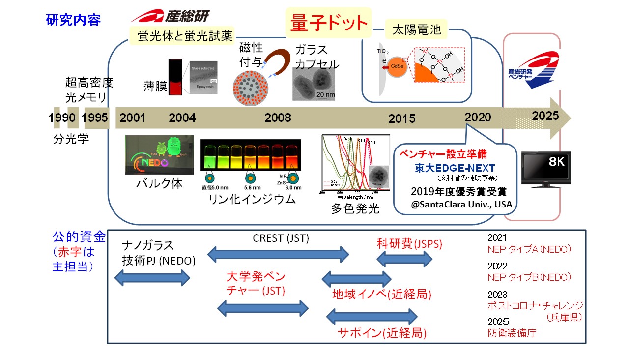 量子ドットの耐久性向上および毒性回避のためにはガラスマトリックスで保護することが有用で、関連の研究論文は10,000件を超えます。 そのうち代表的な手法と結果を系統的、時間的に分類し、ガラスビーズ化を含む自分たちの成果を位置づけました。