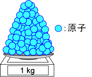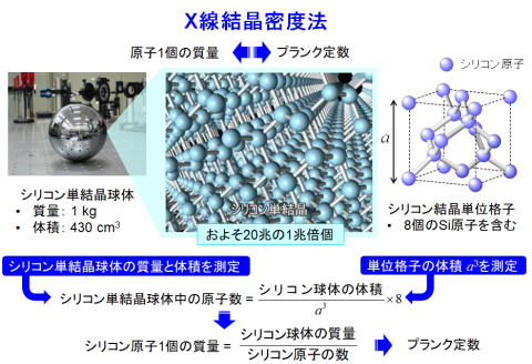 kgのシリコン単結晶でつくられた球体を用います。この球体の中には、下の図に示すように非常にたくさんのシリコン原子が含まれています。この原子の数と球の質量を測定すれば、シリコン原子一個の質量を求めることができます。ただし、球体にはおよそ20兆の1兆倍個の原子が含まれており、一個一個数えるのは大変です。そこで、この単結晶中のシリコン原子のならび具合を良く見てみると、実は単位格子とよばれる立方体が規則正しくたくさん並んでいます。また、一個の単位格子の中には8個のシリコン原子が含まれています。この一辺の長さaはX線を使って測定することができ、単位格子の体積Vをa^3として求めることができます。さらに、この球の質量と体積を測定します。体積Vを単位格子の体積a^3で割った値が、球の中の単位格子の数であり、それに単位格子中の原子の数である8をかければ球体中のシリコン原子の数を求ることができます。さらに球の質量をこの原子数で割れば、シリコン原子1個あたりの質量を求ることができます。