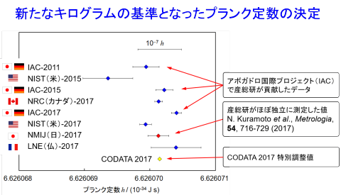 NMIJ-17が、産総研が2017年に決定した値です。この値は以前にアボガドロ国際プロジェクトと呼ばれる国際研究協力で産総研がデータの取得に協力した値(IAC-11、IAC-15、IAC-17)と良く一致しています。また、米国標準技術研究所(NIST)、カナダ国立研究機構(NRC)、フランス国立計量研究所(LNE)がキッブルバランス法によって測定した値(NIST-15、NIST-17、NRC-17、LNE-17)とも良く一致しました。