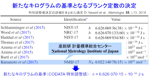 2018)で一般の方にも公開されています。その論文中の、特別調整値決定に採用されたデータの一覧表を上に引用しています。各データが報告された論文、データの名前、測定値がまとめられていますが、NMIJ-17が産総研が2017年に測定したものです。産総研の計量標準総合センターの英語名はNational