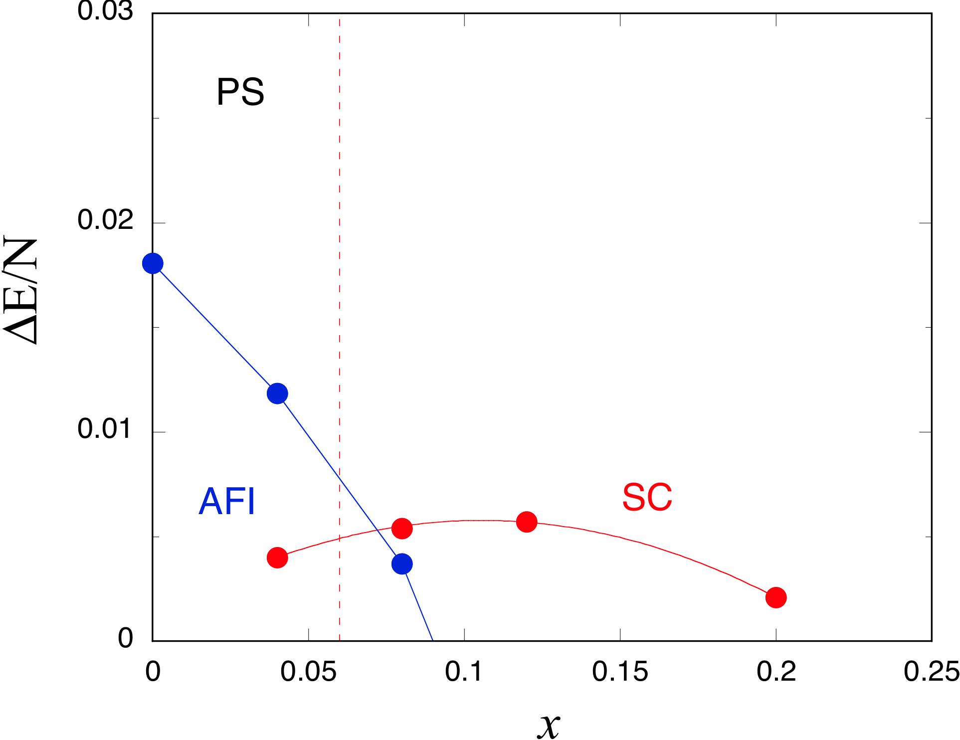 横軸はホール濃度xを表し, 縦軸は反強磁性および超伝導状態の凝縮エネルギーを表す.