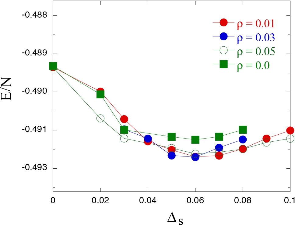 横軸は超伝導オーダーパラメーター Δs を表し, 縦軸は単位サイトあたりのエネルギーを表す.