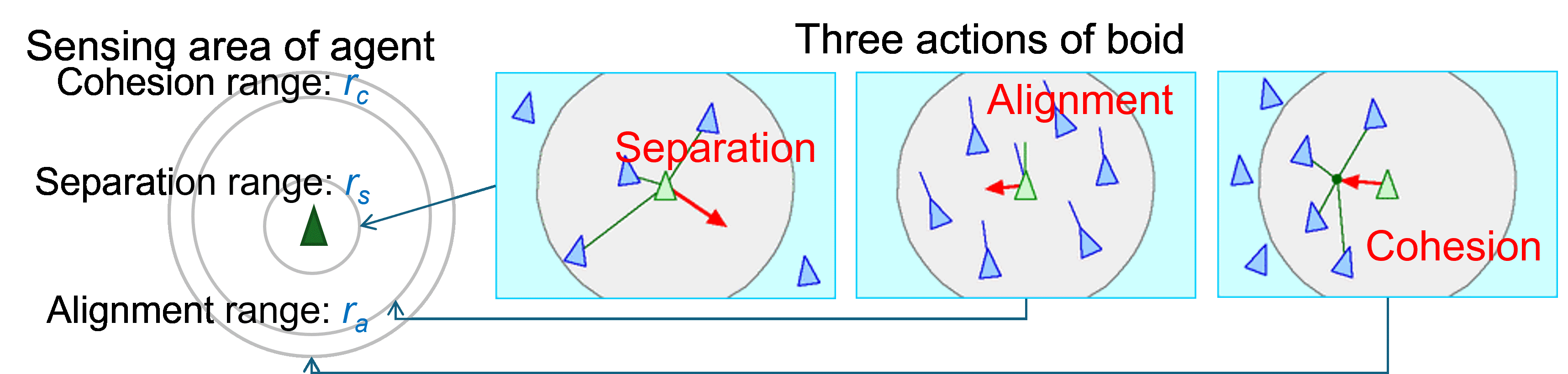 A heterogeneous boid composed of several types of agents also originates from the fish school model (Sakai, S. and Suzuki, R., 1973(2)). In Nakamura, M., 2020, 2022, and 2025, motion equations and simulation conditions are given as follows: