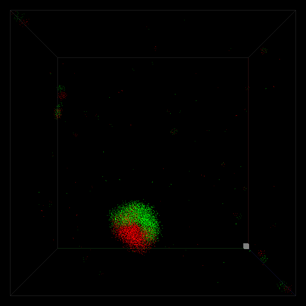 When the interaction differs between types, the interface is minimized to a spherical shell. This video shows an example of simulation using \(W_a =\left[ \begin{smallmatrix} 0.05 & 0.0 \\ 0.0 & 0.1 \\ \end{smallmatrix} \right]\) and \( W_c =\left[ \begin{smallmatrix} 0.05 & 0.01 \\ 0.01 & 0.01 \\ \end{smallmatrix} \right]\).